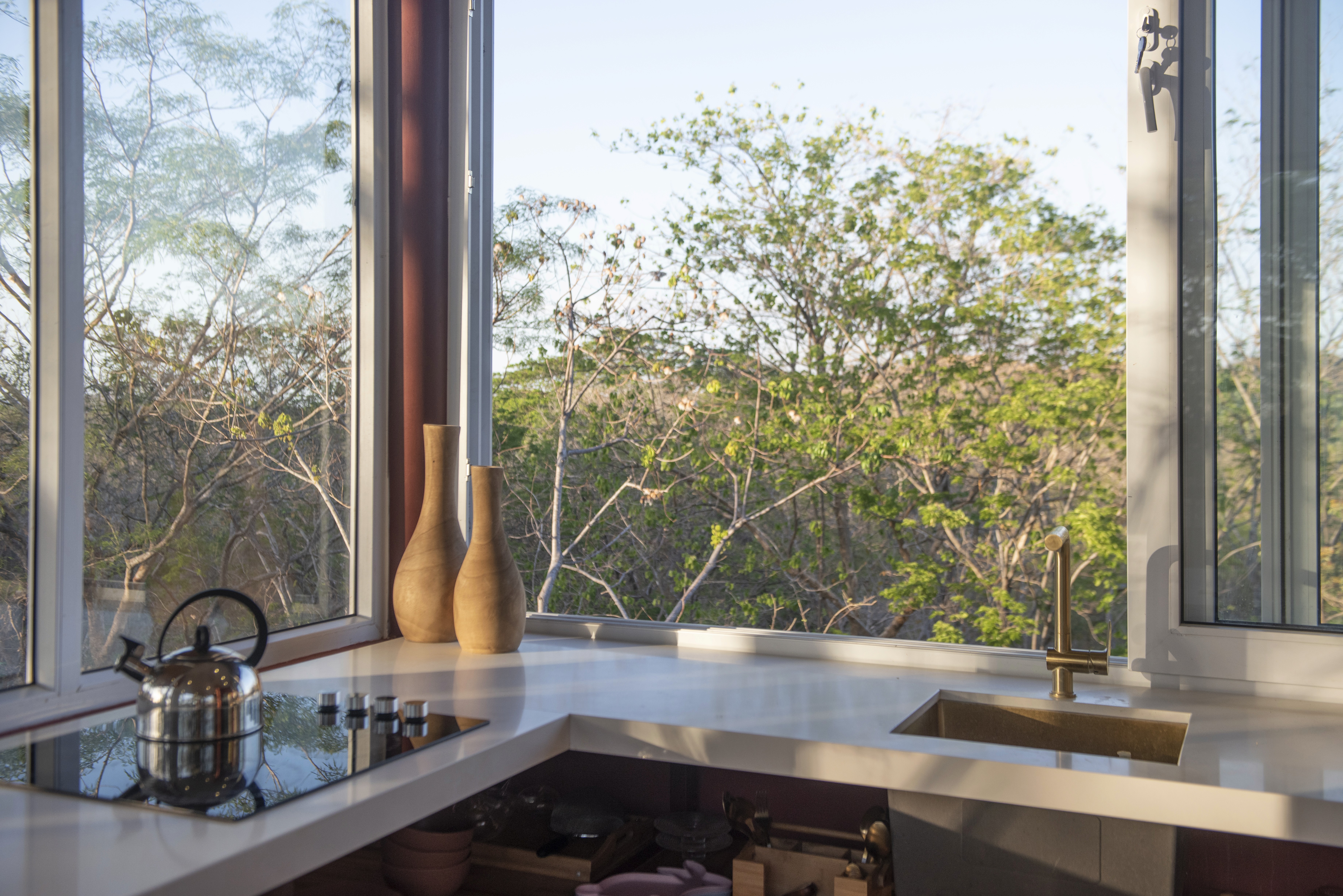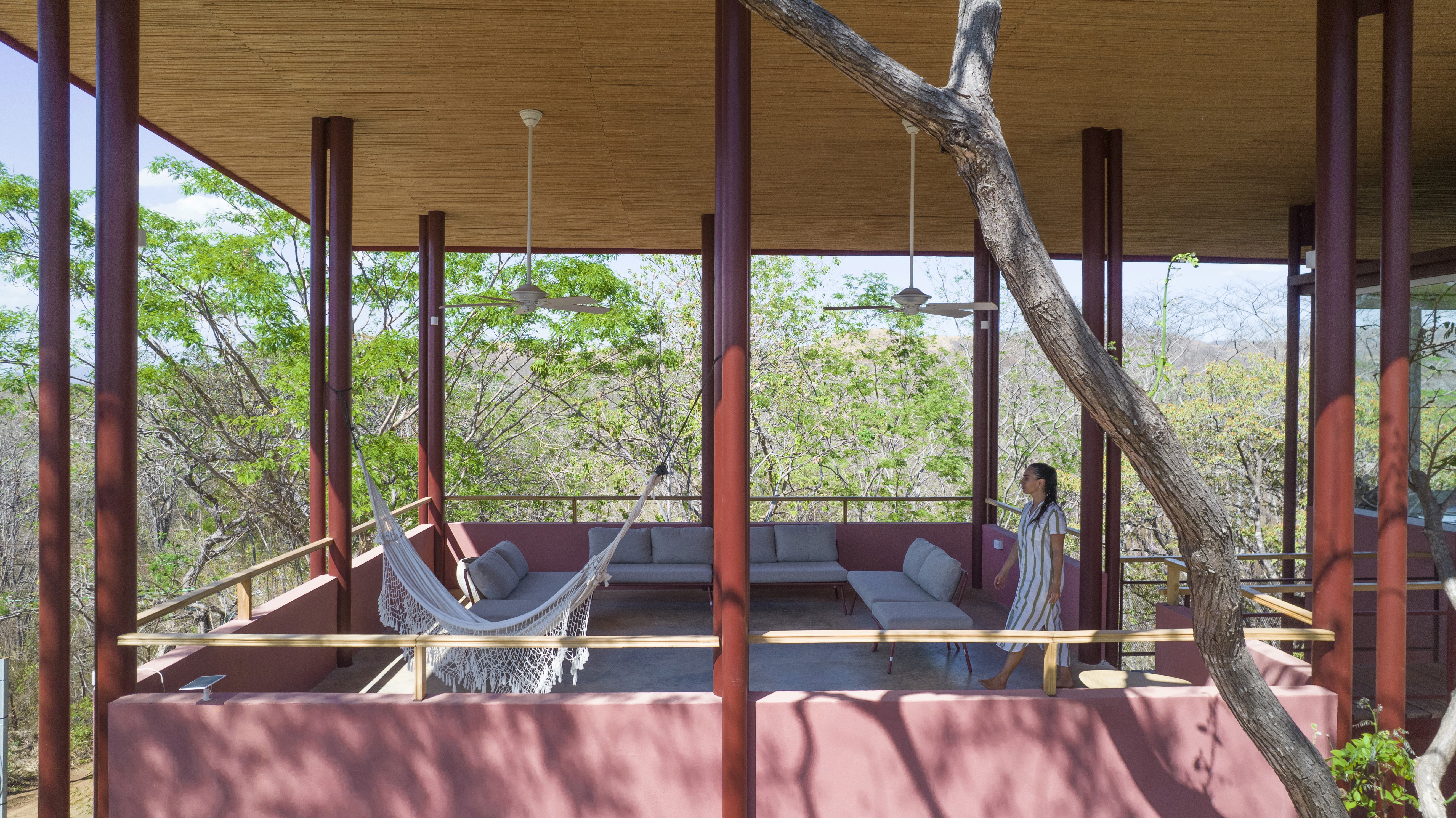 Life at LUNU centres around our open-air restaurant, bar, and pool area. Double-height repurposed shipping containers and a steel structure with warehouse-style windows frame a single palm tree, creating a striking focal point.